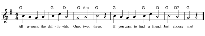 All around the daffodils, One, two, three, If you want to find a friend, Just choose me! |