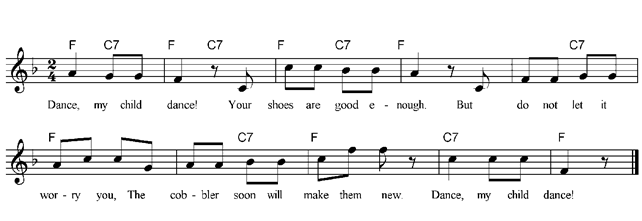 Dance, my child, dance! Your shoes are good enough. But do not let it worry you, The cobbler soon will make them new, Dance, my child, dance!. Tanz,