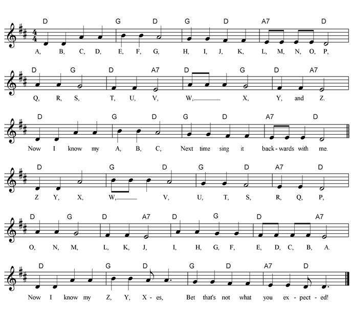 A, B, C, D, E, F, G, H, I, J, K, L, M, N, O, P, Q, R, S, T, U, V, W, X, Y and Z; Now I know my ABC, Next time sing it