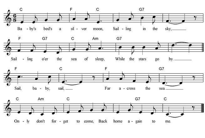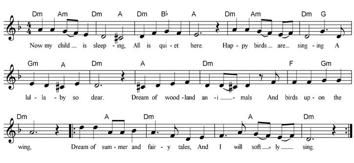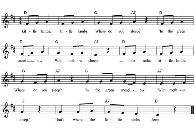 Little lambs, little lambs, Where do you sleep? ‘In the green meadow, With mother sheep.’ Little lambs, little lambs, Where do you sleep? ‘In the green meadow, With mother sheep.’ That's where the little lambs sleep. Little birds, little birds, Where do you rest? ‘Close to our mother In a warm nest.’ Little birds, little birds, Where do you rest? ‘Close to our mother In a warm nest.’ That's where the little birds rest. Baby dear, baby dear, Where do you lie? ‘In my warm bed, With Mother close by.’ Baby dear, baby dear, Where do you lie? ‘In my warm bed, With Mother close by.’ That's where the baby sleeps. |