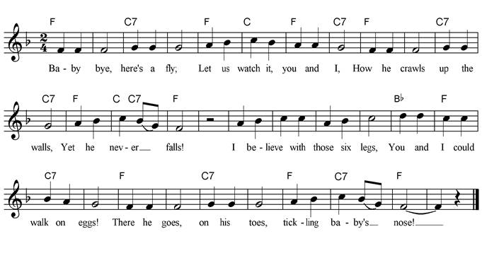 Baby bye, here's a fly; Let us watch it, you and I, How he crawls up the walls, Yet he never falls! I believe, with those six legs, You and I could walk on eggs! There he goes, on his toes, Tickling baby's nose! Spots of red dot his head; Rainbows on his wings are