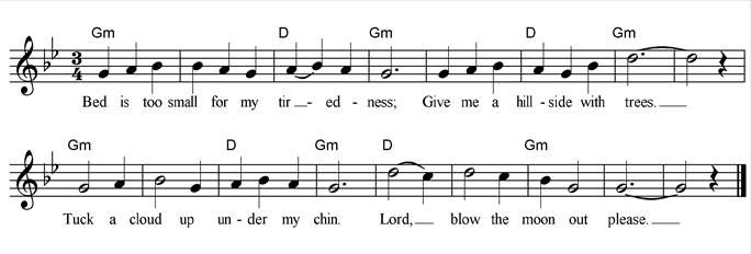 tiredness; Give me a hillside with trees. Tuck a cloud up under my chin. Lord, blow the moon out, please! Rock me to sleep in a cradle of