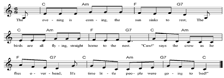 The evening is coming, the sun sinks to rest; The birds are all flying straight home to the nest. "Caw!" says the crow as he flies overhead, “It's time little people were going to bed!” The flowers are closing, the daisy's asleep; The primrose is buried in slumber so deep. Shut up for the night is the pimpernel red; “It's time little people were going to bed!” The butterfly, drowsy, has folded its wing; The bees are returning, no more the birds sing. Their labour is over, their nestlings are fed; “It's time little people were going to bed!” Here comes the pony, his work is all done; Down through the meadow, he takes a good run; Up go his heels and down goes his head; “It's time little people were going to bed!” Good night, little people, good night and good night; Sweet dreams to your eyelids till dawning of light; The evening has come, there's no more to be said, It's time little people were going to bed! |