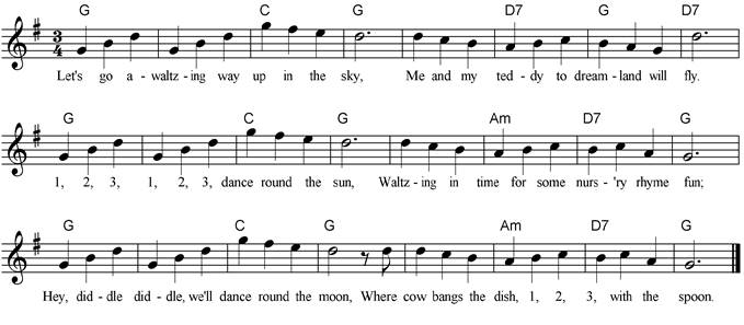 Bedtime waltz 🔊 Sleep is a place where all sorts of mad things can happen as we all know. Dreams here are set in a land where nursery rhyme characters cheerfully accompany a dance round the universe. Words and music by Dany Rosevear. |