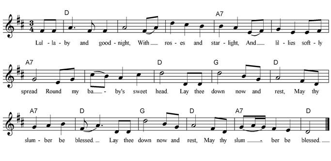 Lullaby, and good night, With roses and starlight, And lilies softly spread Round my baby's sweet head. Lay thee down now, and rest, May thy slumber be blessed. Lay thee down now, and rest, May thy slumber be blessed. Lullaby, and good night, Thy mother's delight, Little angels at your side, My darling abide. Soft and warm is your bed, Close your eyes and rest your