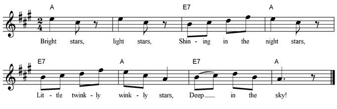 Bright stars, light stars, Shining-in-the-night stars. Little twinkly, winkly stars, Deep in the sky. Yellow stars, red stars, Shine-when-I’m-in-bed stars, Oh, how many blinky stars, Far, far away. |
