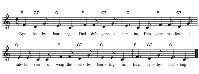 Bye, baby bunting, Daddy's gone a hunting, He’s gone to fetch a rabbit skin, To wrap the baby bunting in. Bye, baby bunting. |