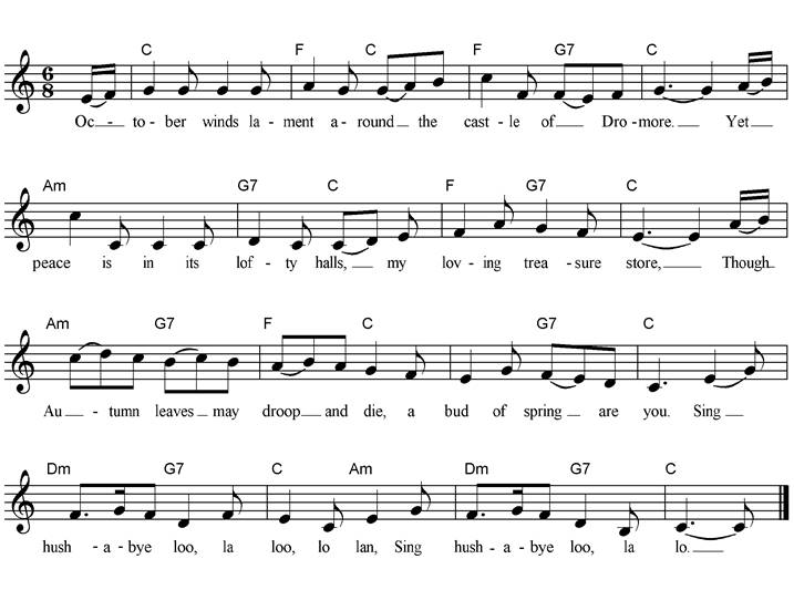 October winds lament around the castle of Dromore, Yet peace is in her lofty halls, my loving treasure store, Though autumn leaves may droop and die, a bud of spring are you. Sing hushabye loo la loo la lan, Sing hushabye loo la lo. Bring no ill winds to hinder us, my helpless babe and me, Dread spirits of the blackwater, Clan Owen's wild banshee, And Holy Mary pitying us, in Heaven for grace doth sue. Sing hushabye loo la loo la lan, Sing hushabye loo la lo. Take time to thrive my ray of hope, in the garden of Dromore. Take heed young eaglet till thy wings are feathered fit to soar. A little rest and then the world is full of work to do. A little rest and then the world is full of work to do. Sing hushabye loo la loo la lan, Sing hushabye loo la lo. |