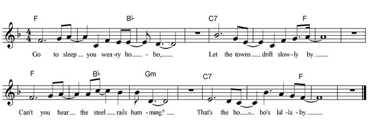 Go to sleep you weary hobo, Let the towns drift slowly by. Can't you hear the steel rail humming. That's a hobo's lullaby. Do not think about tomorrow, Let tomorrow come and go. Tonight you're in a nice warm boxcar, Safe from all this wind and snow. I know your clothes are torn and ragged, And your hair is turning grey. Lift your head and smile at trouble, You'll find happiness someday. |