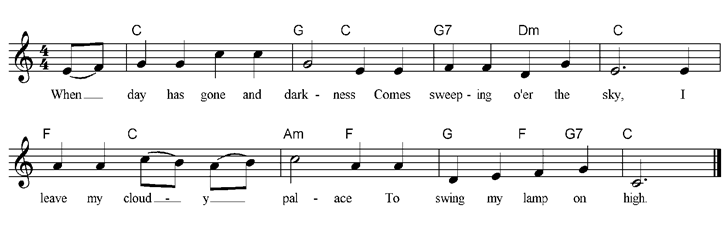 When day has gone and darkness Comes sweeping o’er the sky, I leave my cloudy palace To swing my lamp on high. And all my dear star children Their little lanterns light, And twinkles down to tell you We’re watching through the