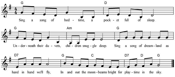 Sing a song of bedtime, a pocket full of sleep. Underneath their duvets, children snuggle deep. Sing a song of dreamland as hand in hand we’ll fly, In and out the moonbeams bright for playtime in the