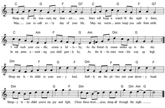 See the baby’s cradle, Rocking to and fro; Listen to my lullaby, Soft and sweet and low, Soft and sweet and low. |