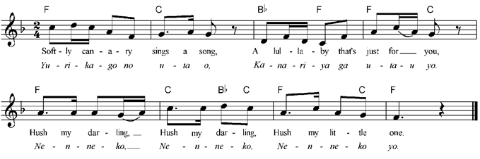 Softly canary sings a song, A lullaby that’s just for you, Hush my darling, Hush my darling, Hush my little one. High up above your swaying cot, Loquat fruits dance up and down, Hush my darling, Hush my darling, Hush my little one. Dear little squirrel swings the rope, Rocks your cradle tenderly, Hush my darling, Hush my darling, Hush my little one. Yellow moon shines gently down, Wishing you the sweetest dreams, Hush my darling, Hush my darling, Hush my little one. Kanariya ga utau yo, Nenneko nenneko nenneko yo. |