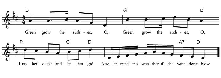 Green grow the rushes, O, Green grow the rushes, O. Kiss (hug) her quick and