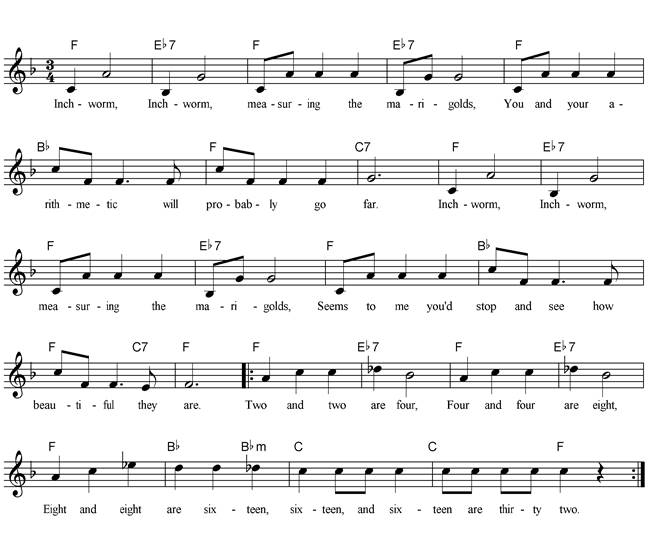Inchworm, Inchworm, Measuring the marigolds, You and your arithmetic Will probably go far. Inchworm, Inchworm, Measuring the marigolds, Seems to me you'd stop and see How beautiful they are. Two and two are four, Four and four are eight, Eight and eight are sixteen, Sixteen and sixteen are thirty-two. Two and two are four, Four and four are eight, Eight and eight are sixteen, Sixteen and sixteen are thirty-two. Inchworm, Inchworm, Measuring the marigolds, Seems to me you'd stop and see How beautiful they are.