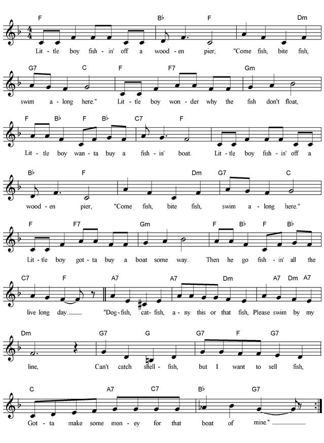Little boy fishin’ off a wooden pier, “Come fish, bite fish, swim along here.” Little boy wonder why the fish don't float, Little boy wanta buy a fishin’ boat. Little boy fishin’ off a wooden pier, “Come fish, bite fish, swim along here.” Little boy gotta buy a boat some way, Then he go fishin’ all the live long day. Chorus “Dog fish, cat fish, any this or that fish, Please swim by my line, Can't catch shell fish, but I want to sell fish, Gotta make some money for that boat of mine.” Little boy dreaming with a secret smile, Some day sail away, Cannibal Isle, Little boy wonder when his boat will come, Little boy slumber now the day is done. Chorus Little boy fishin’ off a wooden pier, “Come fish, bite fish, swim along here.” Little boy sleepy and he sail away, In his dreamboat down to Blanket Bay. |