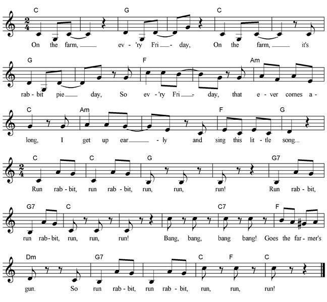 On the farm, ev'ry Friday, On the farm, it's rabbit pie day, So ev'ry Friday, that ever comes along, I get up early and sing this little song... Chorus Run, rabbit, run, rabbit, run, run, run! Run, rabbit, run, rabbit, run, run, run! Bang, bang, bang, bang! Goes the farmer's gun. So run, rabbit, run, rabbit, run, run, run! Run, rabbit, run, rabbit, run, run, run! Don't give the farmer his fun, fun, fun. He'll get by without his rabbit pie, So run, rabbit, run, rabbit, run, run, run! On the farm, no poor rabbit, Comes to harm because I grab it. They jump and frolic whenever I go by, They know I help them to dodge the rabbit pie! Chorus |