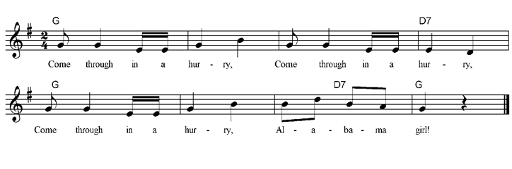 1. Come through in a hurry (x3) Alabama Girl! 2. I don’t know how, how (x3) Alabama Girl! 3. I'll show you how, how (x3) Alabama Girl! 4. Ain't I rock candy (x3) Alabama Girl? |