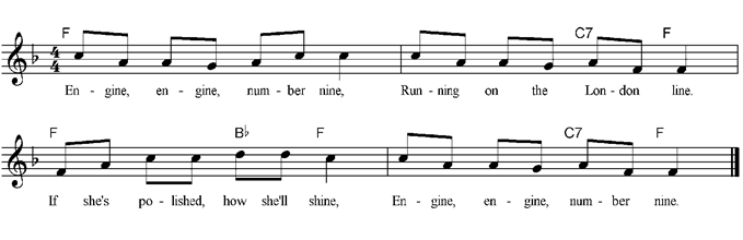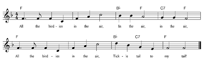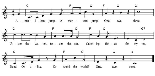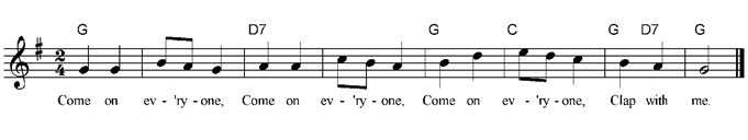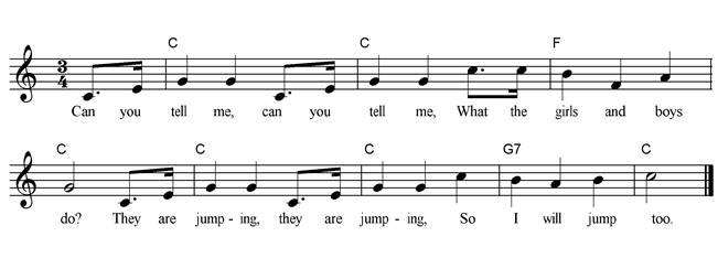 Let’s all go walking, Hi-dee-roon, oh! Let’s all go walking, Hi-dee-roon, oh! Let’s all go walking, Hi-dee-roon, oh! Let’s all go walking, Hi-dee-roon. Let’s all go hopping… Let’s all go skipping… Let’s go a-creeping… Let’s make a circle… |