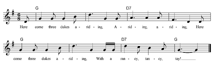 Here come three dukes a-riding, A-riding, a-riding, Here come three dukes a-riding, With a rancy, tancy, tay! What is your good will, sirs? Will, sirs? will, sirs? What is your good will, sirs? With a rancy, tancy, tay! Our good will is to marry, To marry, marry, Our good will is to marry, With a rancy, tancy, tay! You won’t get one of us, sirs, Us, sirs, us, sirs, You won’t get one of us, sirs, With a rancy, tancy, tay! You're all as stiff as pokers, Pokers, pokers, You're all as stiff as pokers, With a rancy, tancy, tay! We can bend as much as you, sirs, You, sirs, you, sirs, We can bend as much as you, sirs, With a rancy, tancy, tay! Through the kitchen and down the hall, I choose the fairest of you all, The fairest one that I can see Is come along