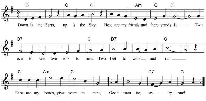 is the Earth, up is the Sky, Here are my friends, and here stands I; Two eyes to see, two ears to hear, Two feet to walk and run! Here are my hands, give yours to mine, Good morning everyone! |