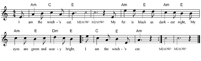 I am the witch's cat. MIAOW! MIAOW! My fur is black as darkest night, My eyes are green and scary bright. I am the witch's cat. MIAOW! MIAOW! I am the witch's broomstick. SWISH! SWISH! I fly so high up in the sky, And past the moon go whizzing by. I am the witch's broomstick. SWISH! SWISH! I am the witch's owl. TOO-WHIT TOO-WHOO! I sit and stare with round black eyes, Then hunt for mice and toads nearby. I am the witch's owl. TOO-WHIT TOO-WHOO! |