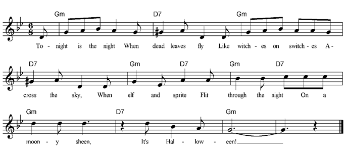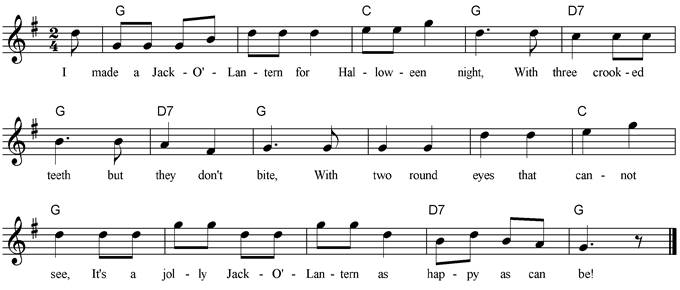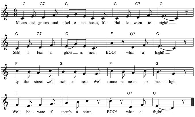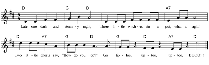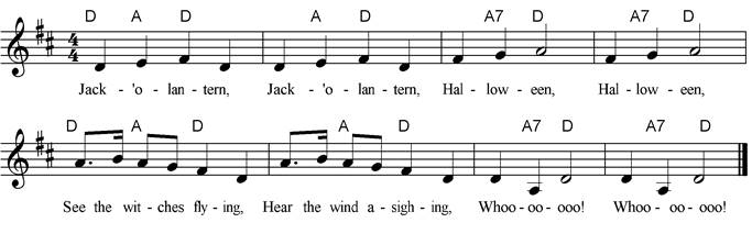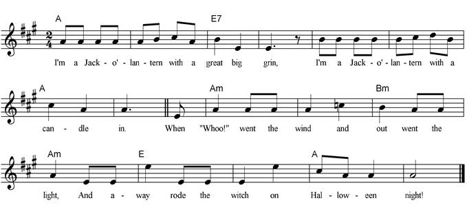 Jack-o’-lantern, Halloween, Halloween, See the witches flying, Hear the wind a sighing, Whoo-oo-ooo! Whoo-oo-ooo! |