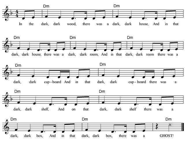 In a dark, dark wood, there was a dark, dark house, And in that dark, dark house, there was a dark, dark cupboard, And in that dark, dark cupboard, there was a dark, dark shelf, And on that dark, dark shelf, there was a dark, dark box, And in that dark, dark box, there was a GHOST! |