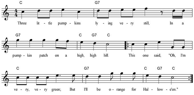 Three little pumpkins lying very still, In a pumpkin patch on a high, high hill. This one said, "Oh, I'm very, very, green; But I'll be orange for Halloween." This one said, “Oh, me! oh my, One day I’ll be a pumpkin pie.” This one said, “I’m on my way To be a Jack o’ lantern some day.” |