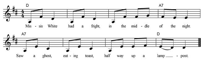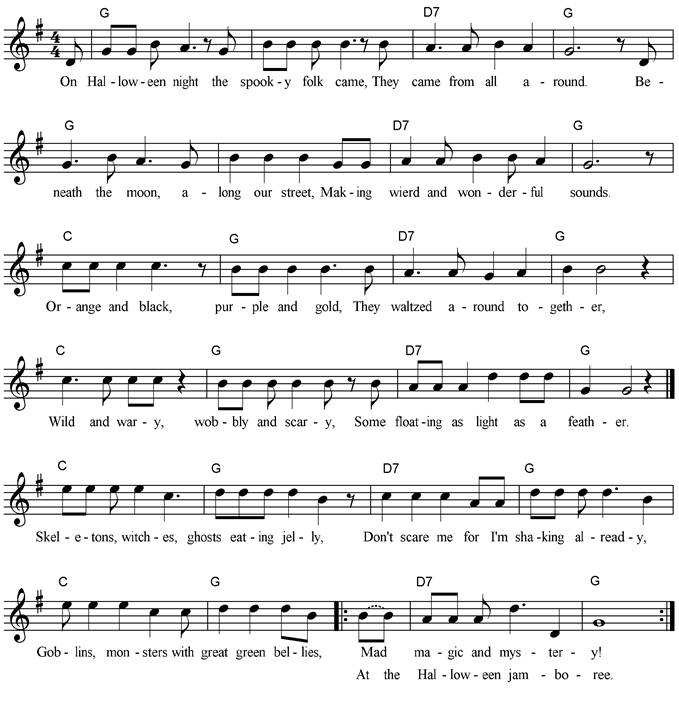 Halloween night the spooky folk came. They came from all around. Beneath the moon, along our street, Making weird and wonderful sounds. Orange and black, purple and gold, They waltzed around together; Wild and wary, wobbly and scary, Some floating as light as a feather. Chorus: Skeletons, witches, ghosts eating jelly, Don’t scare me for I’m shaking already, Goblins, monsters with great green bellies, Mad mischief and mystery! At the Halloween jamboree. On Halloween night hear cries and calls, “Come and join us – if you dare!” Jack-o’-lanterns grin as the fun begins Looking out for who they can scare. Knocks on doors, giggles galore - It’s time for trick and treating! In disguises, full of surprises Friends and families meeting! Chorus |