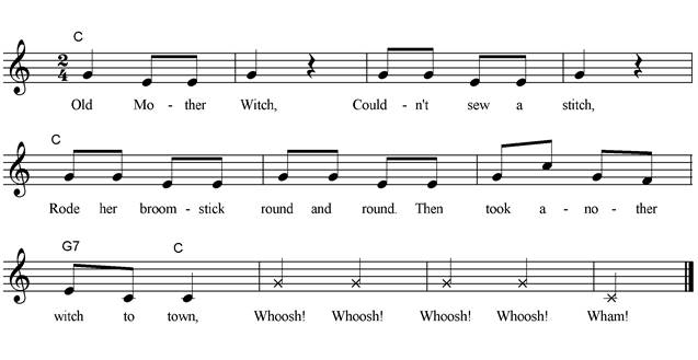 Old mother witch, Couldn’t sew a stitch, Rode her broomstick round and round, Took another witch to town. Whoosh! Whoosh! Whoosh! Whoosh! Wham! Old father wizard, Couldn’t find his lizard, Waved his wand round and round, Took a wizard off to town. Whoosh! Whoosh! Whoosh! Whoosh! Wham! |