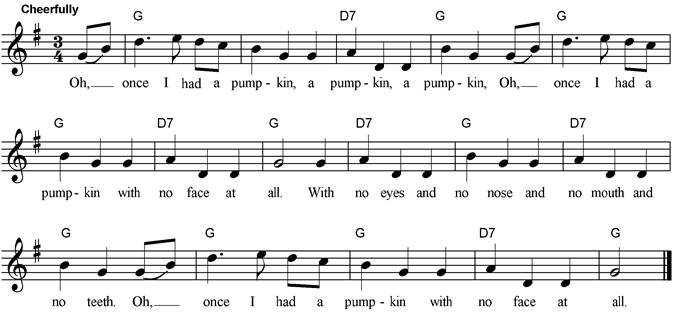 Pumpkin, pumpkin, round and fat, Turn into a jack-o-lantern Just like that! Pumpkin, pumpkin, pumpkin pie, Yummy, yummy, in my tummy, Pumpkin pie!