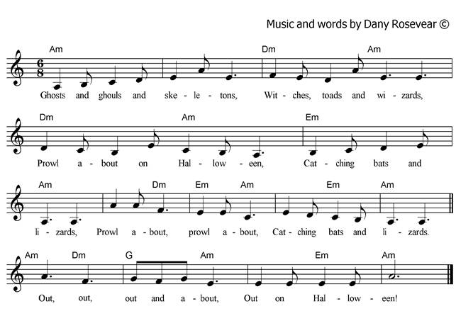 Ghosts and ghouls and skeletons, Witches, toads and wizards, Prowl about on Halloween, Catching bats and lizards; Prowl about, prowl about, Catching bats and lizards. Chorus Out, out, out and about, Out on Halloween! Jack-o’-lanterns, goblins, monsters, Scarecrows, owls and spiders, Trick or treat on Halloween, In and out the houses; Trick or treat, trick or treat, In and out the houses. Chorus |