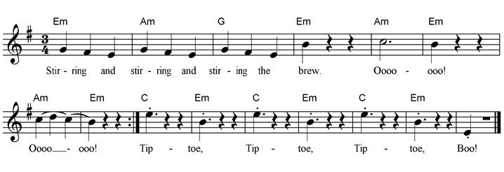 stirring the brew. Oooo-ooo! Oooo-ooo! Tip-toe, Tip-toe, Tip-toe,