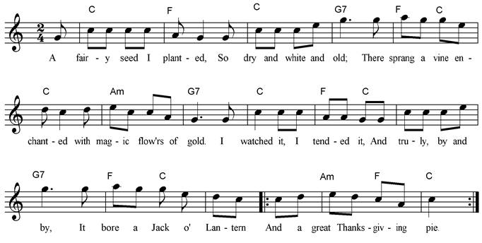 Three little pumpkins sitting on a fence, A witch came riding by, Ha, Ha, Ha! I’ll take just one, To make a pumpkin pie. Ha ! Ha ! Two little pumpkins sitting on a fence, A witch came riding by, Ha, Ha, Ha! I’ll take just one, To make a pumpkin pie. Ha ! Ha ! One little pumpkin sitting on a fence, A witch came riding by, Ha, Ha, Ha! I’ll take just one, To make a pumpkin pie. Ha ! Ha ! No little pumpkins sitting on a fence, Just a witch with green, green eyes, Oh dear me my tummy’s so full, From eating pumpkin pie. Ha ! Ha ! |