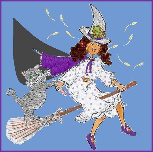 Here's the witch in her pointed hat, And here's her cauldron, round and black. Here's the witch's magic spell: Stir it round and mix it well. Here's her broomstick, long and Away she flies or she'll be late. |