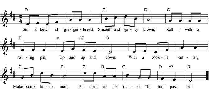 Stir a bowl of gingerbread, Smooth and spicy brown. Roll it with a rolling pin, Up and up and down. With a cookie cutter, Make some little men. Put them in the oven Till half past ten! |