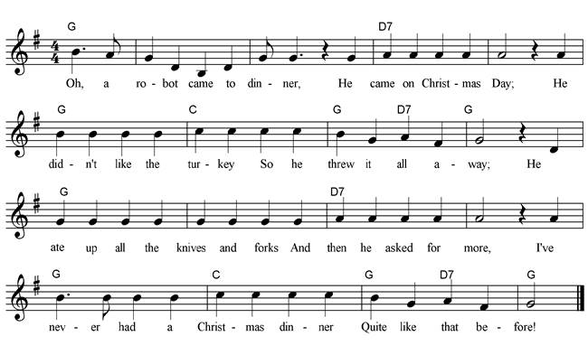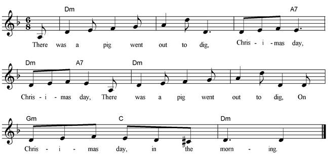 There was a pig went out to dig, Chris-i-mas day, on Chris-i-mas day, There was a pig went out to dig, On Chris-i-mas day in the morning. There was a cow went out to plough, Chris-i-mas day, on Chris-i-mas day, There was a cow went out to plough, On Chris-i-mas day in the morning. There was a sparrow went out to harrow... There was a crow went out to sow... There was a sheep went out to reap... |