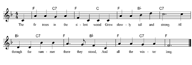 The fir trees in the silent wood Grew slowly tall and strong. All through the summer there they stood, And all the winter long. The furry rabbits hopped about Beneath their boughs all day, Until a wolf came bounding out To frighten them away. There came a woodsman in the sleigh To cut a fir tree down. He chose a tree and chopped away And carried it to town. The little fir tree bright with toys Stands here on Christmas day, And all the children gather round To clap hands, dance and play. |