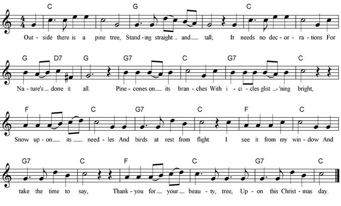 Outside there is a pine tree, Standing straight and tall. It needs no decorations For Nature's done it all. Pine cones on its branches With icicles glistening bright, Snow upon its needles And birds at rest from flight. I see it from my window, And take the time to say, Thank you for your beauty, tree, Upon this Christmas day. |