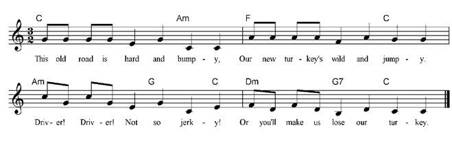 trot blues game is from Liza Meyer’s website: MeyersMusic. Children sit in a circle with a farmer and turkey on the outside and