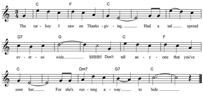 The turkey I saw on Thanksgiving, / before Christmas Had a tail spread ever so wide. Shhh! Don’t tell anyone that you’ve seen her, For she’s running away to hide! |