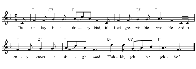 The turkey is a funny bird, It’s head goes wibble, wobble. And it only knows a single word, “Gobble, gobble, gobble.” |