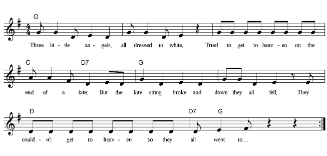 Three little angels all dressed in white, Tried to get to heaven on the end of a kite; But the kite string broke and down they all fell, They couldn't get to heaven so they all went to... Two little angels... One little angel... Three little devils all dressed in red, Tried to get to heaven on the end of a bed; But the bed post broke and down they all fell, They couldn't get to heaven so they all went to... Two little devils... One little devil... Three little leprechauns all dressed in green, Tried to get to heaven on a sewing machine; But the needle broke and down they all fell, They couldn't get to heaven so they all went to... Two little leprechauns... One little leprechaun... Dont get excited, dont lose your head, Instead of going to heaven they all went to bed! |
