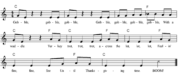 Gobble, gobble, gobble, Gobble, gobble, gobble, gobble, With a waddle. Turkey trot, trot, trot, Across the lot, lot, lot, Feeling fine, fine, fine, Until Thanksgiving time. Trouble, trouble, trouble, Trouble, trouble, trouble, trouble, On the double... BOOM! |