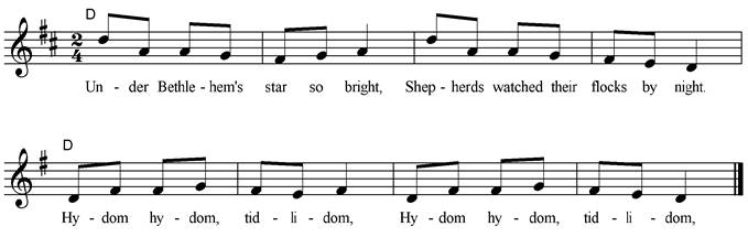 Under Bethl’lem’s star so bright, Shepherds watched their flocks by night. Chorus: Hydom, hydom, tid-li-dom, Hydom, hydom, tid-li-dom. Came an angel telling them They must go to Bethlehem. “Hasten hasten” they did say, “Jesus Christ you’ll find that way.” “Sleeping in a manger bare Lies the holy child so fair” Mary rocks him tenderly, Joseph sings a lullaby. |