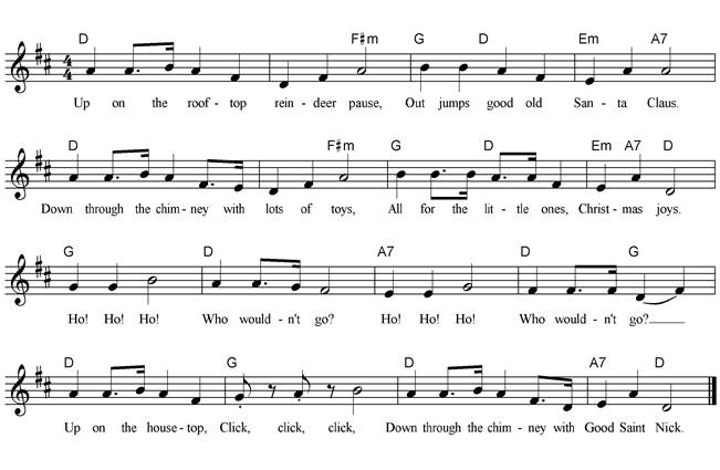 Up on the rooftop reindeer pause, Out jumps good old Santa Claus. Down through the chimney with lots of toys, All for the little ones, Christmas joys. Chorus Ho, ho, ho! Who wouldn’t go? Ho, ho, ho! Who wouldn’t go? Up on the housetop, click, click, click, Down through the chimney with good Saint Nick. First comes the stocking of little Nell; Oh how Santa has filled it well; Here is a teddy, she laughs and cries, Each little parcel a big surprise! Chorus Next comes the stocking of little Will, Oh, just see what a glorious fill; Here is a hammer and lots of tacks Also a train and a railway track. Chorus. Pa, ma, and uncle, and grandma too, All I declare have something new; Even the baby enjoys his part, Shaking a rattle, well bless his heart. Chorus Rover come here, are you all alone, Haven't they tossed you an extra bone? Here's one to gladden your honest jaws Now wag a "Thank you!" to Santa Claus. |