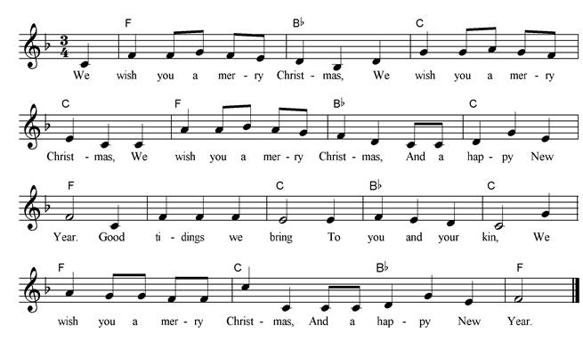 We wish you a merry Christmas, We wish you a merry Christmas, We wish you a merry Christmas, And a happy New Year. Chorus Good tidings we bring To you and your kin, We wish you a merry Christmas, And a happy New Year. Now bring us some figgy pudding x3 And bring some out here. We all like our figgy pudding x3 With all its good cheer. We won’t go until we’ve got some x3 So bring some out here. |