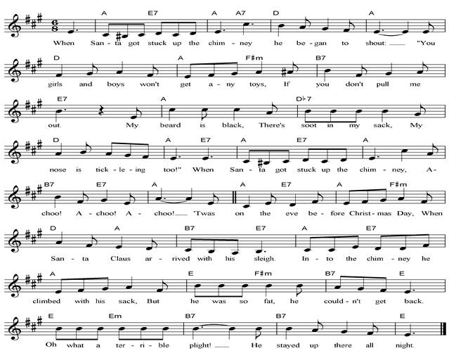 too!" When Santa got stuck up the chimney, Achoo! Achoo! Achoo! 'Twas on the eve before Christmas day, When Santa Claus arrived on his sleigh. Into a chimney he climbed with his sack, But he was so fat, he couldn't get back. Oh, what a terrible plight! He stayed up there all night. When Santa got stuck up the chimney, he began to yell; "Oh hurry, please. It's all such a squeeze. The reindeer's stuck