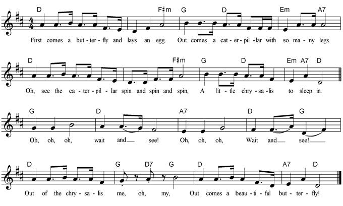 A fuzzy little caterpillar Curled up on a leaf, Spun herself a chrysalis And then fell fast asleep. While she was a-sleeping She dreamt that she could fly, And later when she woke up - She was a butterfly! |
